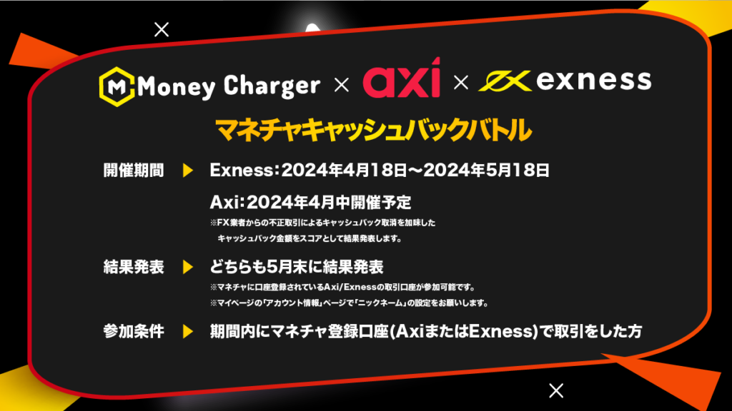 マネチャの第5回キャッシュバック大会はExnessは2024年4月18日に、Axiは2024年4月中に開催されます。