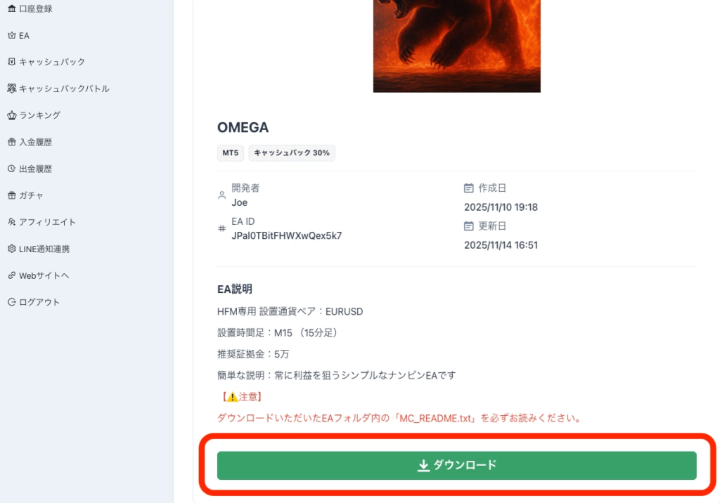承認が完了したらEAファイルがダウンロードできるようになりますので、以下の画像を参考にEAメニューからファイルをダウンロードしてください。