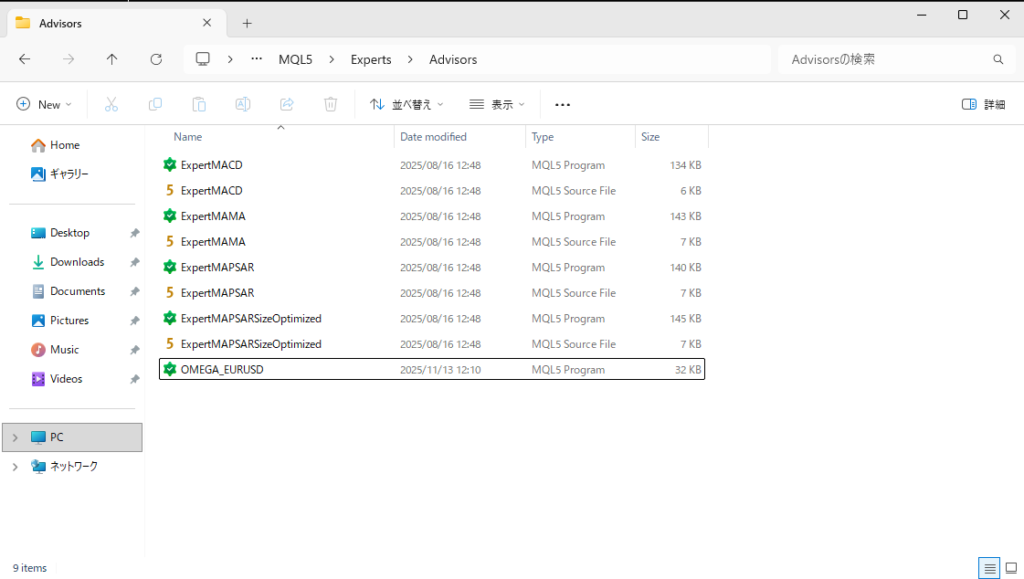 次に「MQL5」→「Experts」→「Advisors」を開き、7.でダウンロードしたMQL5 Programファイルをドラッグ&ドロップします。