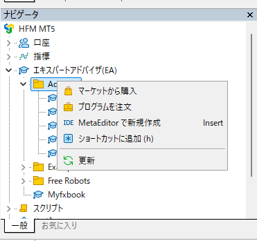 MT5アプリの右側のナビゲーターのタブ内のAdvisorsフォルダを右クリックし、「更新」をクリックします。