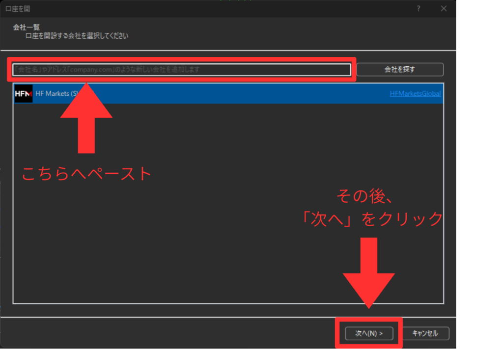 ⑤HFMから送られてきている「HFM/MT5 Live Account Opened」というメールを確認し、サーバー情報をコピー&ペーストします。