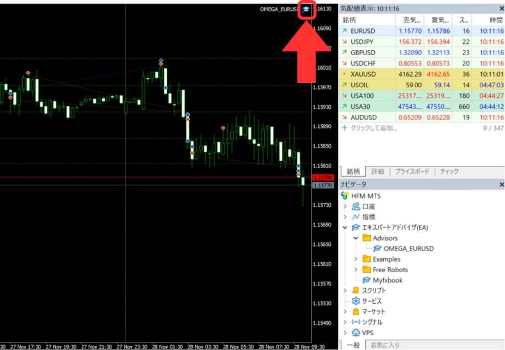 矢印で示したボタンをクリックしてEAの稼働を開始しましょう!