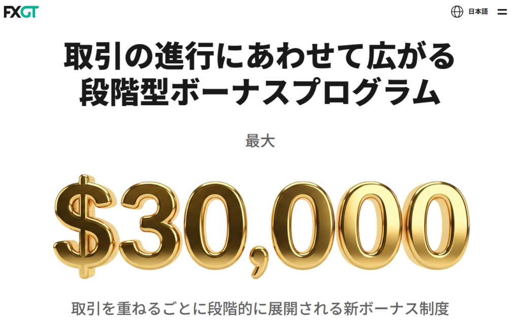 ![]() FXGT | Equivalent to $70 (approximately 10,000 yen) | [First-time purchase] 120% (up to $400 equivalent) [Limited time offer] 80% (up to $1,600 equivalent) [Cashback] 30% (Optimus) | 〇 | detail | Total $30,000 in tiered bonuses, 90-day SP Elite Program , plus $1,000 worth of credits. |
