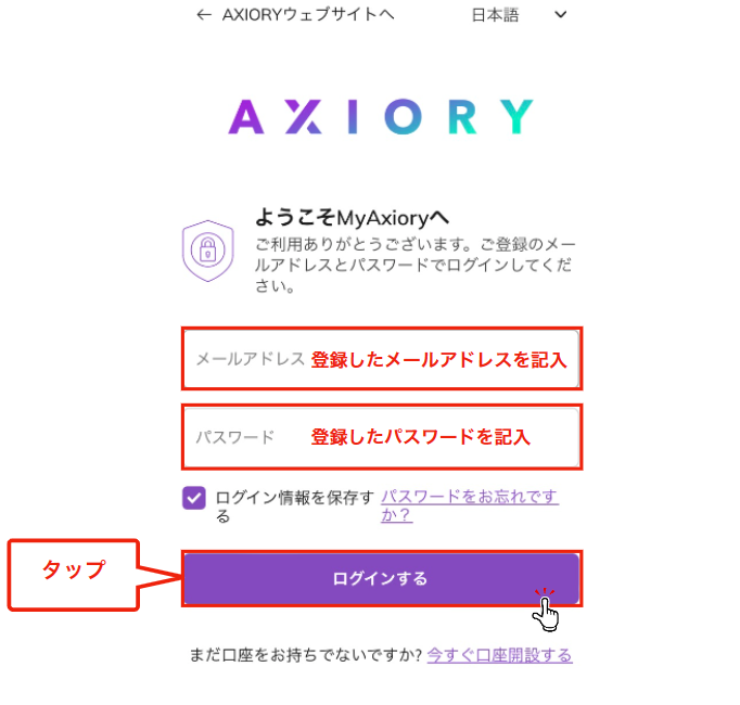 Axiory(アキシオリー)ログイン画面が表示されます。