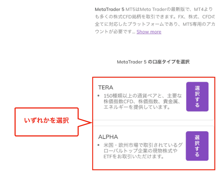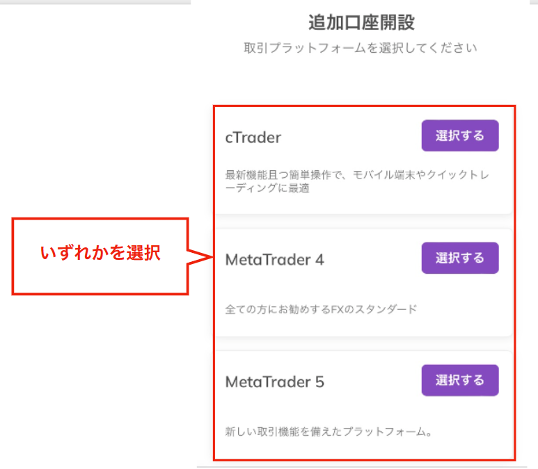 利用したいプラットフォームを「cTrader」「MetaTrader4」「MetaTrader5」の中から選択します。
