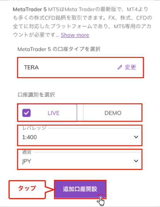 口座のスペックを選択した後は、「追加口座開設」をタップしてください。