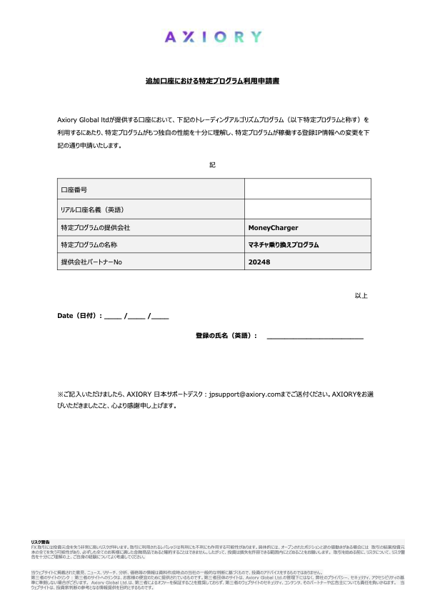 マネチャ経由以外で開設された口座の紐づけ先を、マネチャのキャッシュバック口座へ変更する場合は、以下の画像【追加口座における特定プログラム利用申請書】をAXIORY公式サポート(jpsupport@axiory.com)へご提出ください。
