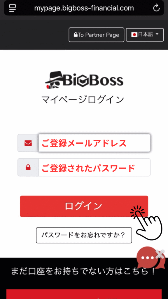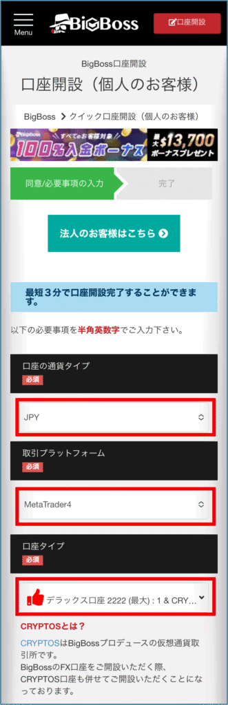まずは、下記のリンクからBigBoss(ビッグボス)の「クイック口座開設」ページに遷移します。