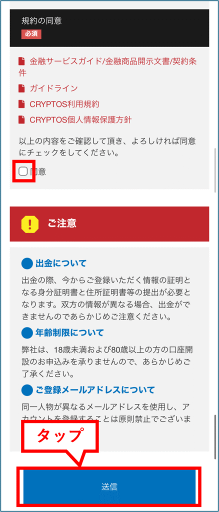 最後に、規約の同意にチェックを入れて、「送信」をタップします。