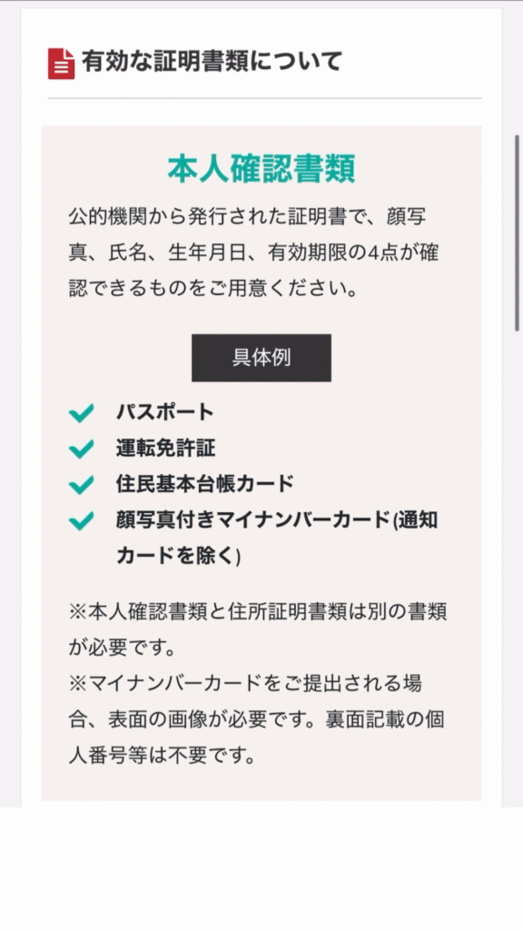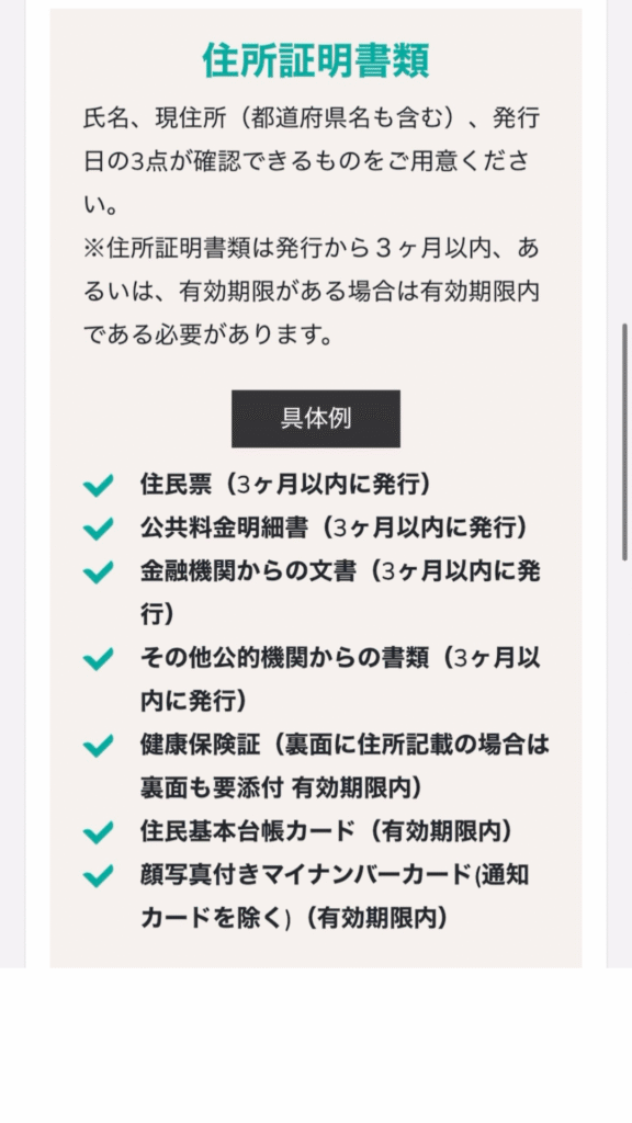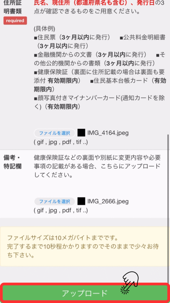 下部の「アップロード」をタップして、本人確認書類と住所確認書類を提出してください。