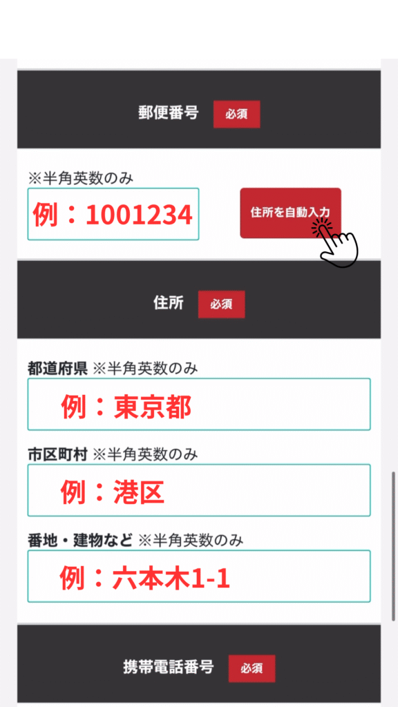 住所は郵便番号を入力後、「住所を自動入力」をタップしていただくと自動で住所が記入されます。