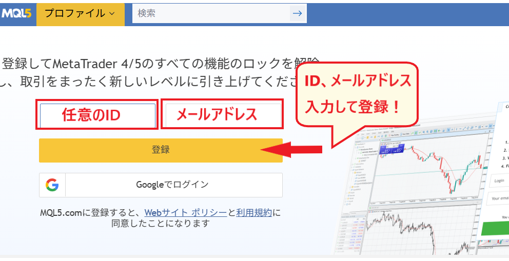 次に、EAをマーケットからインストールするために、MQL5の新規登録を行います。