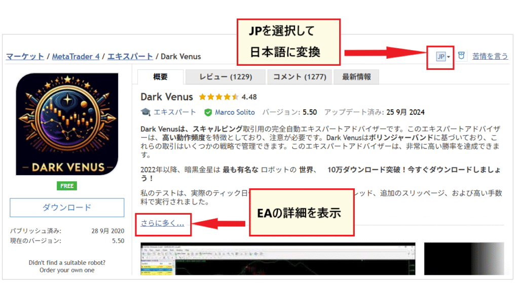 EAの詳細ページの右上にある小さな「言語マーク」をクリックしてください。言語リストから「JP」を選択すると、日本語表記に変わります。
