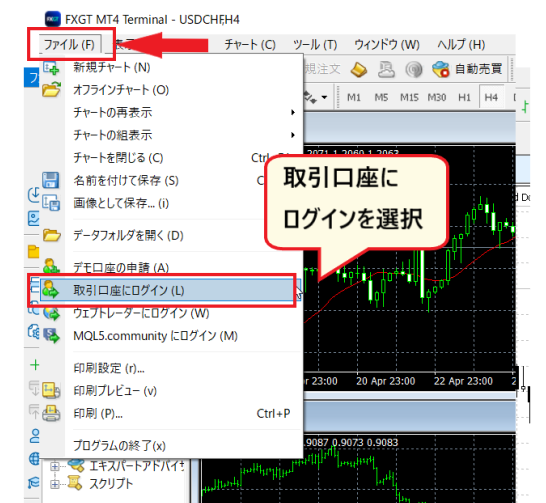 MT4のメニューバー「ファイル」→「取引口座にログイン」を選択。ログイン画面にIDとパスワードを入力してログインできます。