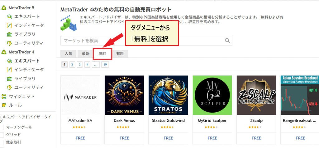 Step2.マーケットのページが表示されます。左端のメニューから「MetaTrader4」「エキスパート」を選択。
