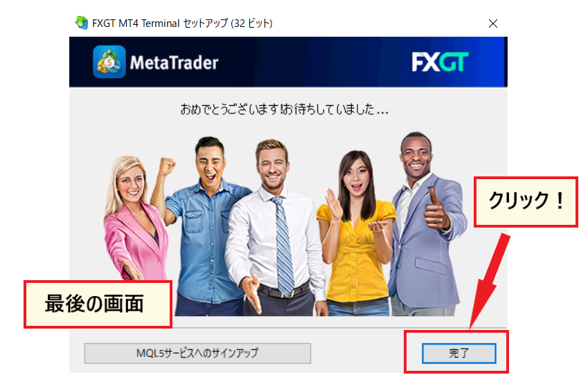 最後に完了画面が出てきたら、「完了」ボタンをクリック。PCにMT4・MT5が表示されます。