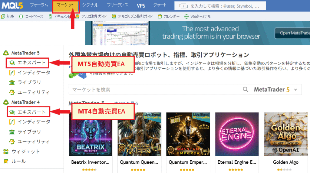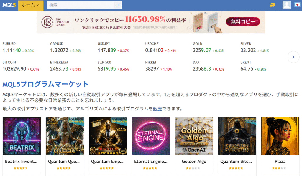 EAは、MT4・MT5サイトに連携している「MQL5」という情報サイトで入手できます。