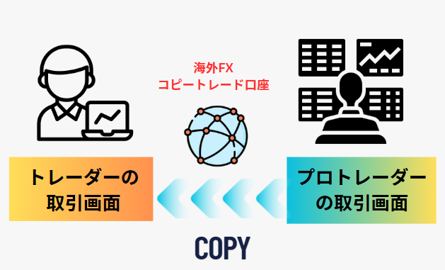 コピートレードとは、自分の口座とプロの口座を紐付けて、プロの裁量トレードをコピーする手法です。つまり、初心者でもプロの取引で稼げるわけです。