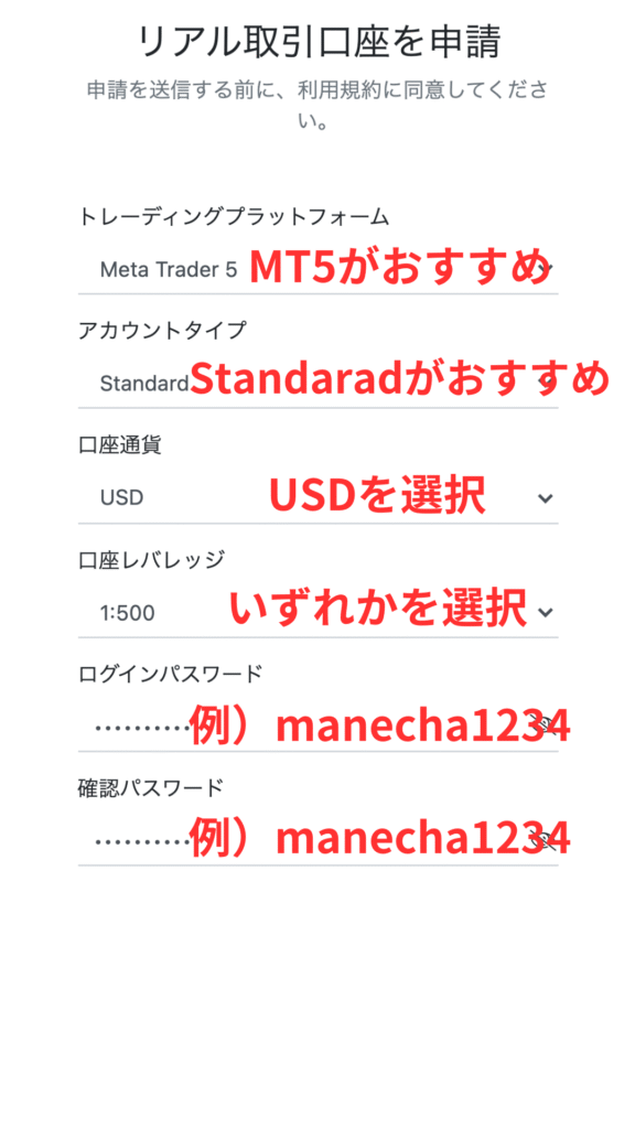 取引口座の種別を選択し、マイページへのログインパスワードを記入します。