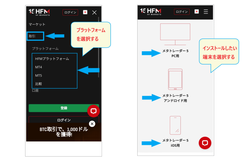 HFM公式サイトのメニュー「取引」→「MT5(MT4)」を選択します。MT5(MT4)のページを下の方にスクロールすると端末を選択する画面が出てきます。
