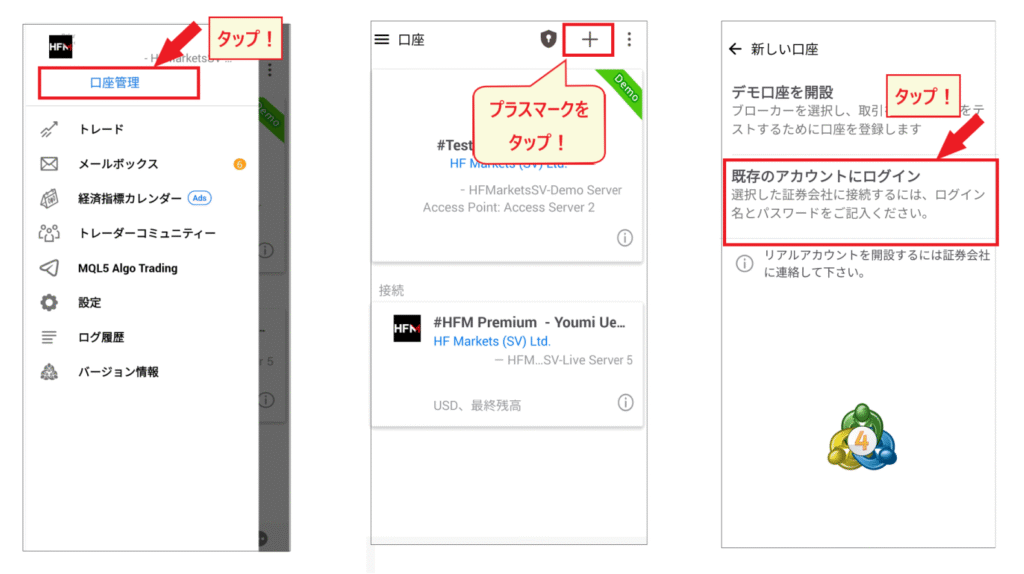 MT5の右上にあるメニューを開いて、「口座管理」→次の画面で「+マーク」をタップしてください。そうすると、「デモ口座を開設」または「既存のアカウントにログイン」という画面が出てきます。