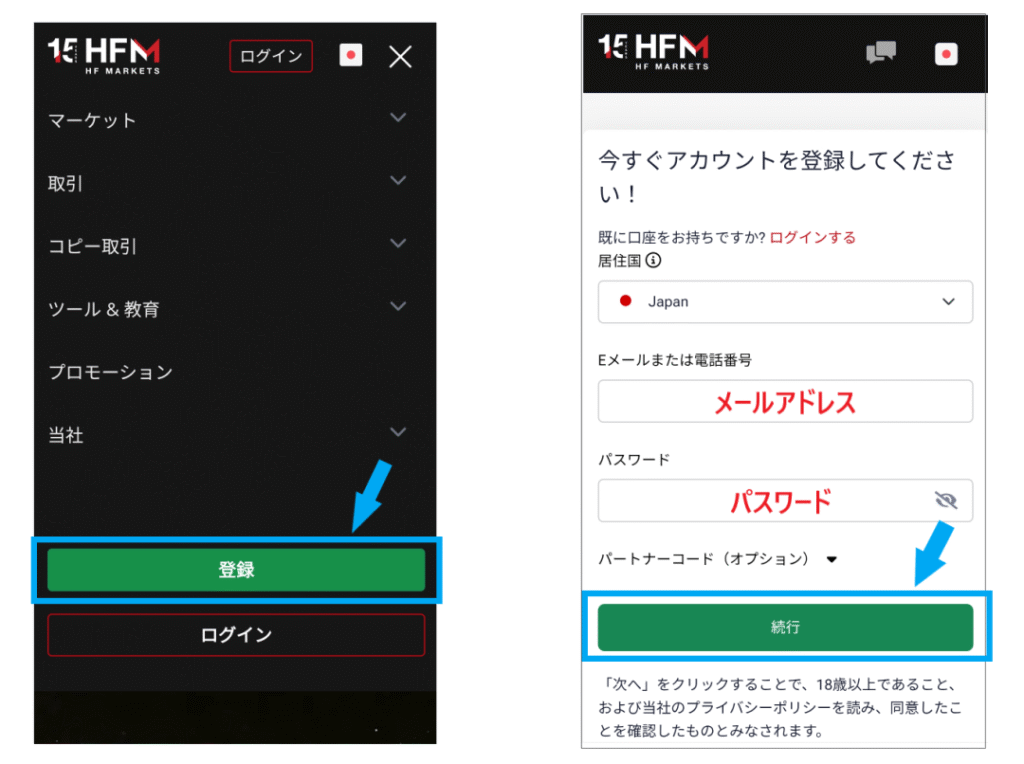 HFMの公式サイト、トップ画面右上にある「メニュー」から「登録」をタップします。