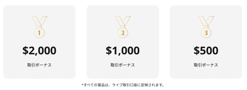 上位入賞者には、3位500ドル~1位2,000ドル分の取引ボーナスが付与されます。この賞金を軍資金に、HFMで現金を稼ぐチャンスが得られるわけです。