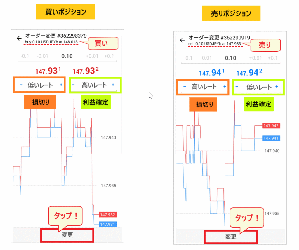 損切り、または利確のみを入力して注文することも可能です。レートを確認して問題がなければ「変更」ボタンをタップして注文を確定します。