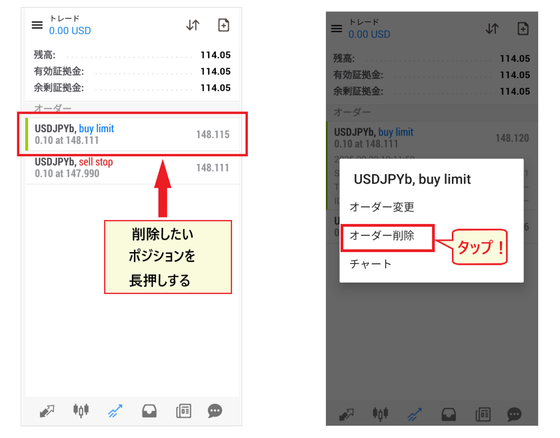 注文を取り消す場合は、取引画面にある注文リストから削除したいポジションを長押しします。メニューが出てくるので、「オーダー削除」を選択して取り消しが行えます。