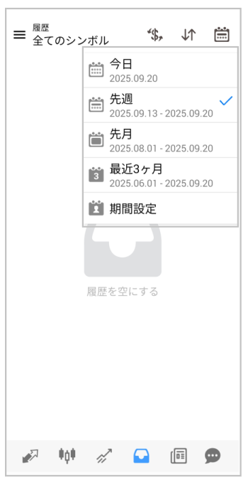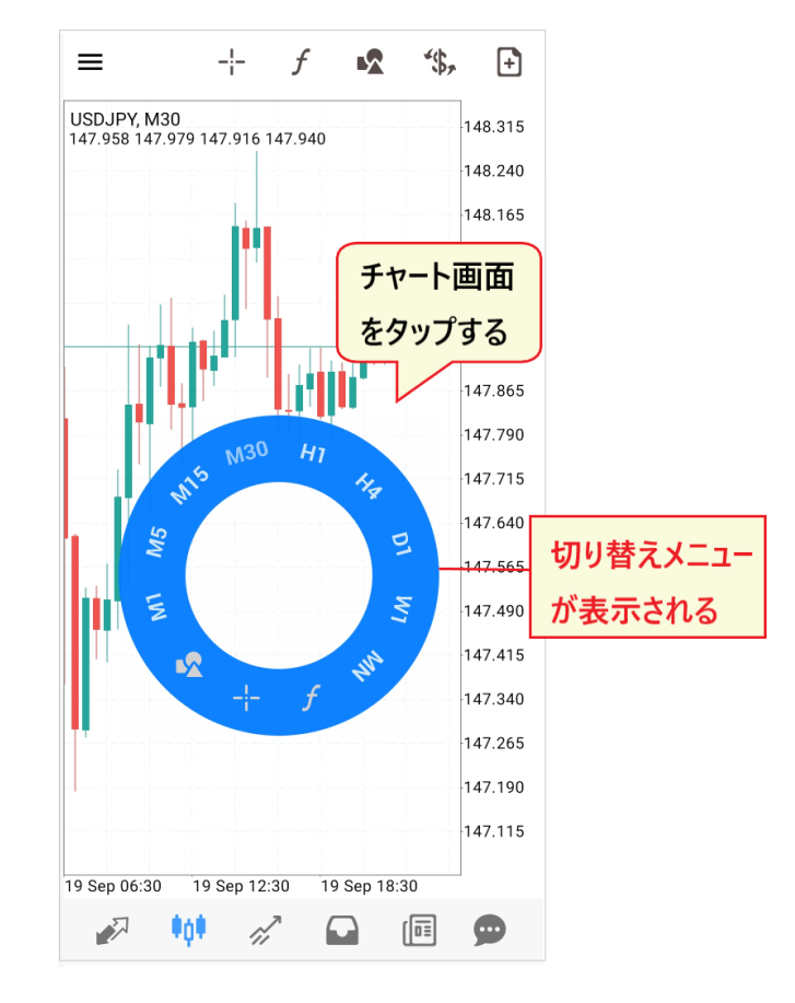 チャート画面からは、右上にある「ドキュメントマーク」をタップすると注文画面が表示可能です。