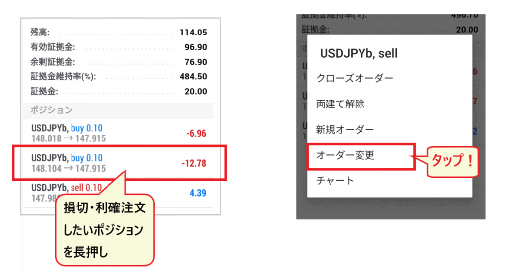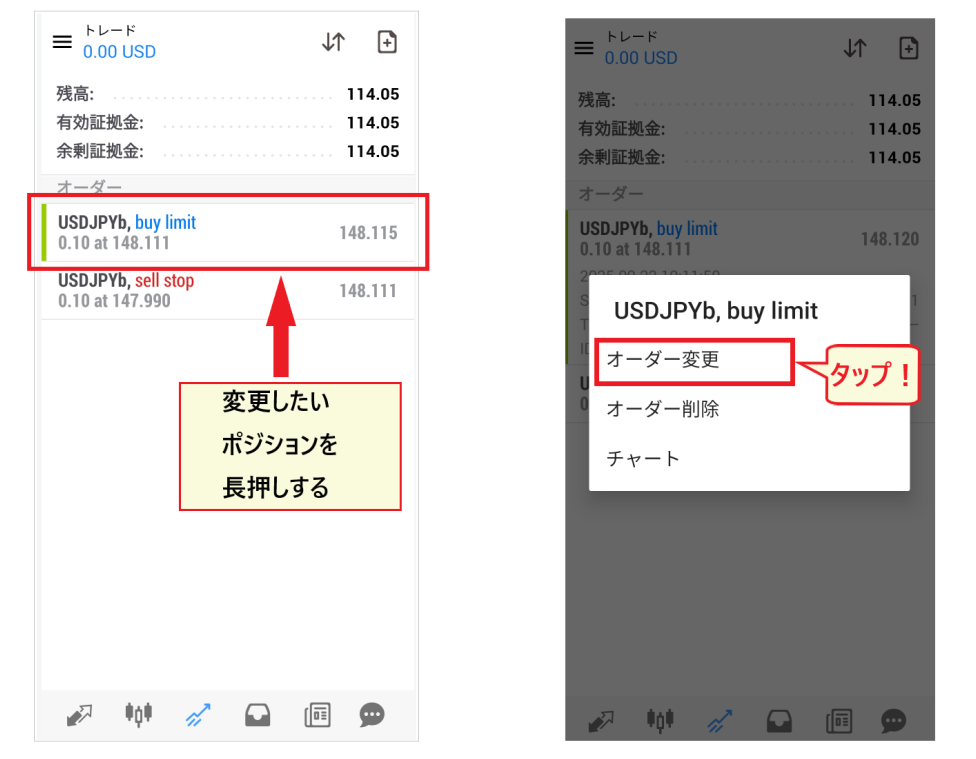 損切り・利確注文を変更する方法は、「取引」画面のポジションを長押しして、メニュー「オーダー変更」から、既存の注文画面を開いてレートの訂正を行います。