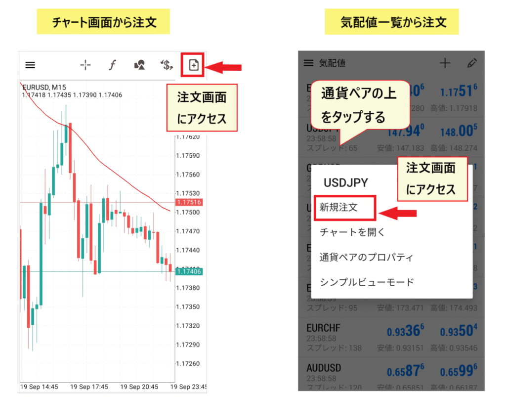 注文する際に、最初に抑えておきたいのが注文画面を表示する2つの方法です。注文画面は「気配値一覧」からと「チャート画面」からとアクセスできます。