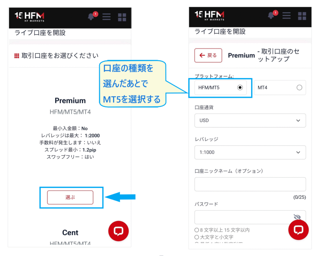 HFMの口座開設では、口座の種類を選んだあとでMT5かMT4を選択する項目が最初に出てきます。デフォルトでMT5にチェックが入っていますが、必ず確認するようにしてください。もし、間違えてMT4を選択してしまった時には、同じ口座を選択してMT5で設定し直せば大丈夫です。数分で開設できます。