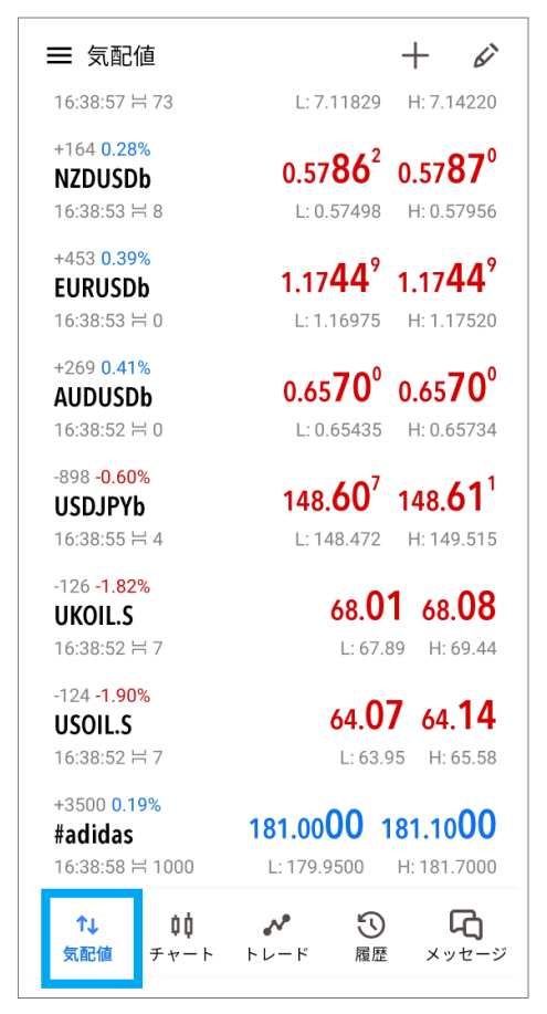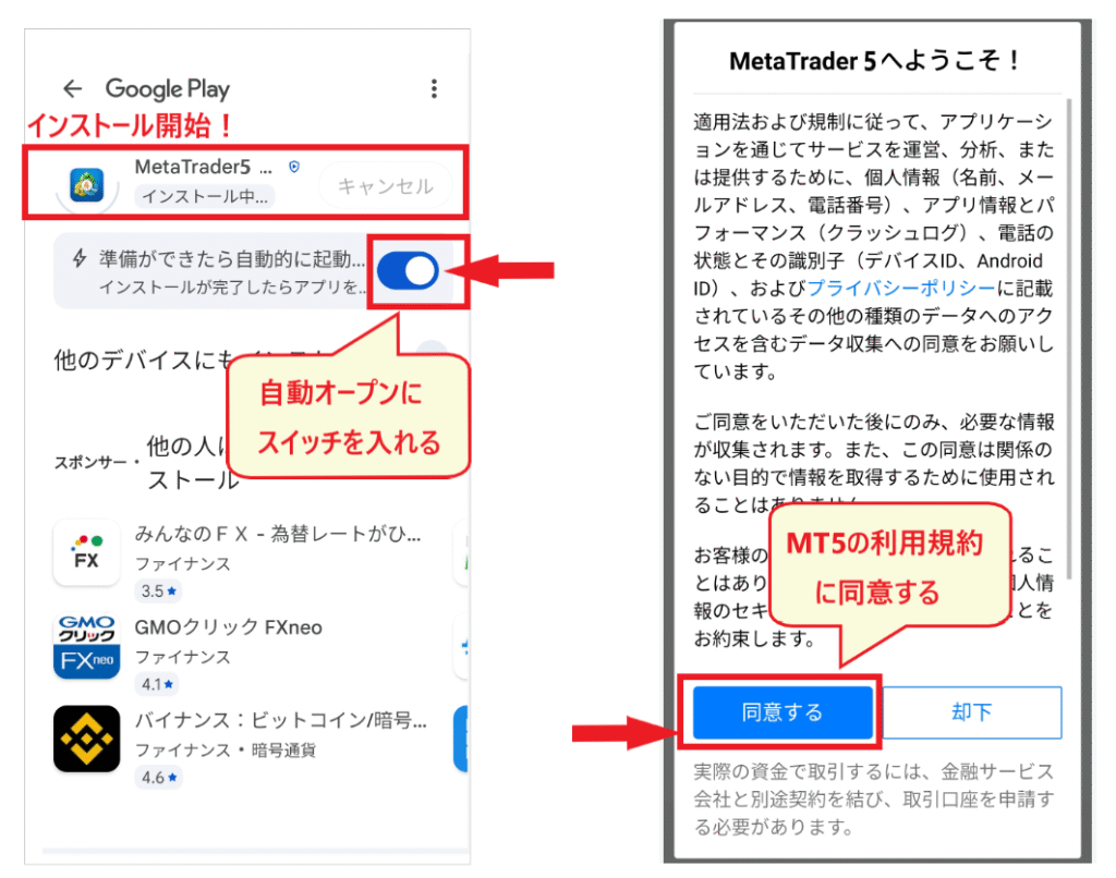インストールが完了するとMT5アプリが開きますので、「利用規約」に「同意する」をタップしてください。そうすると画面がMT5の画面に切り替わります。