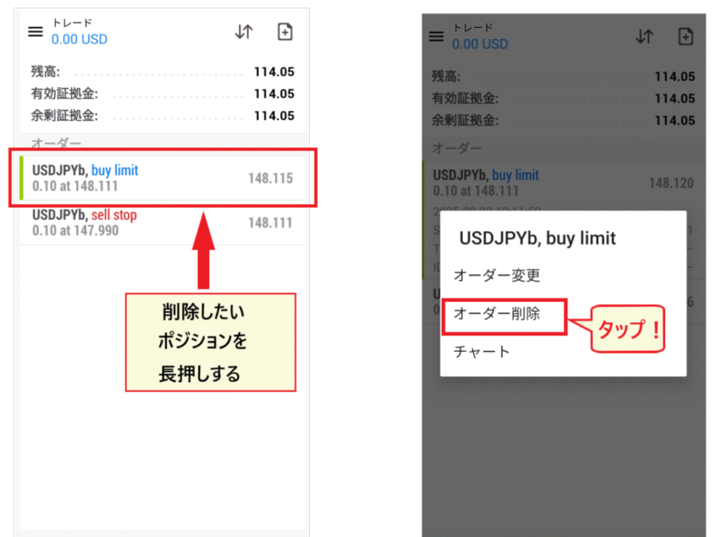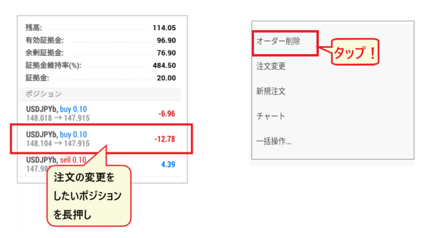 削除したいポジションを長押しして、ポップアップメニューの「オーダー削除」または「オーダー変更」をタップします。