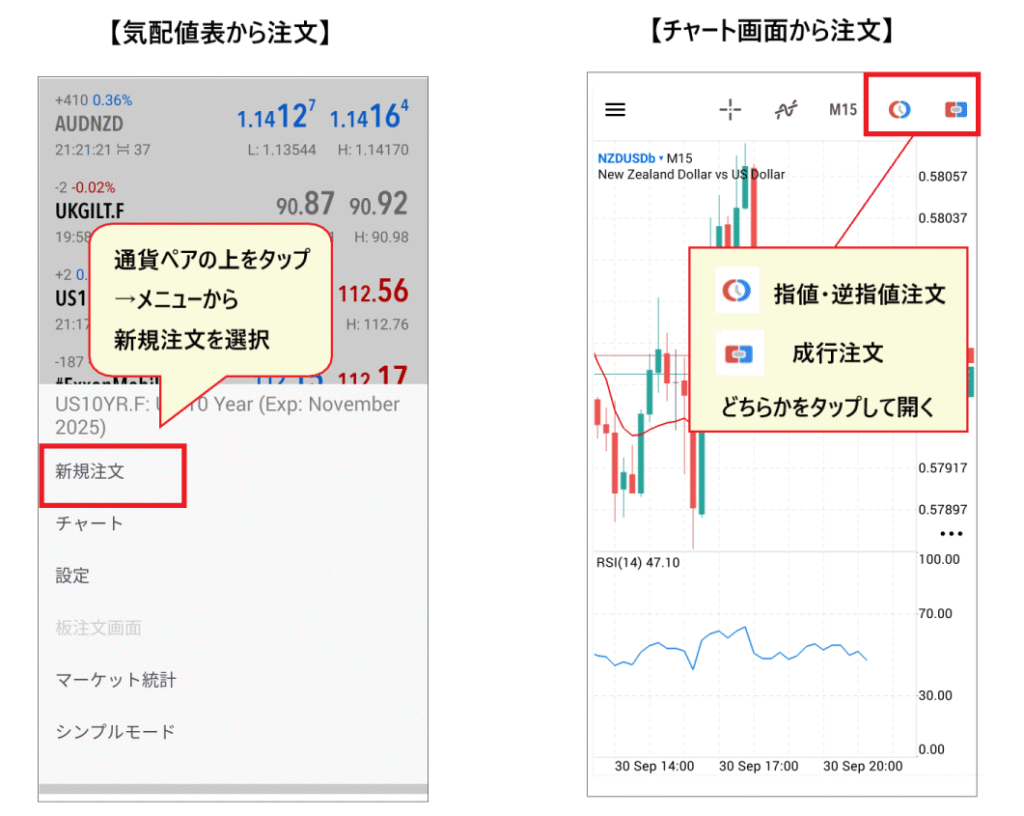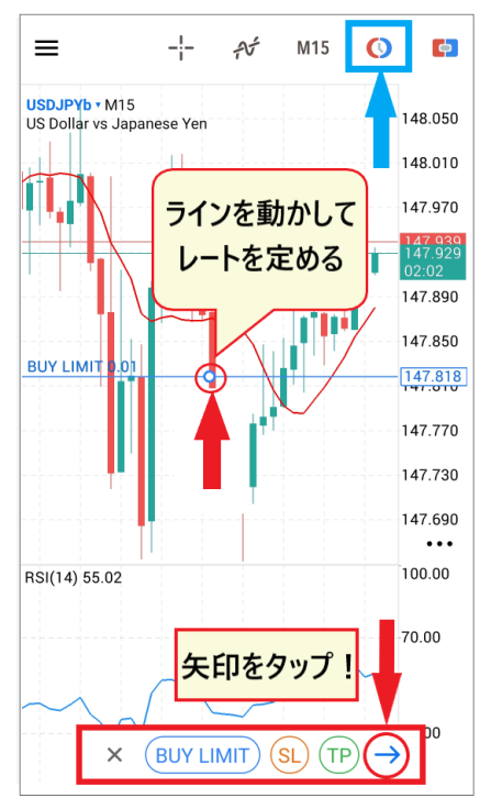 チャート画面上部にある「注文マーク」をタップして、ラインを動かしながらエントリーの場所を決めます。