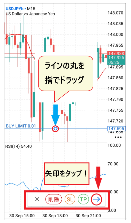 ラインの中央にある丸を指でドラッグして注文のレートを変更できます。