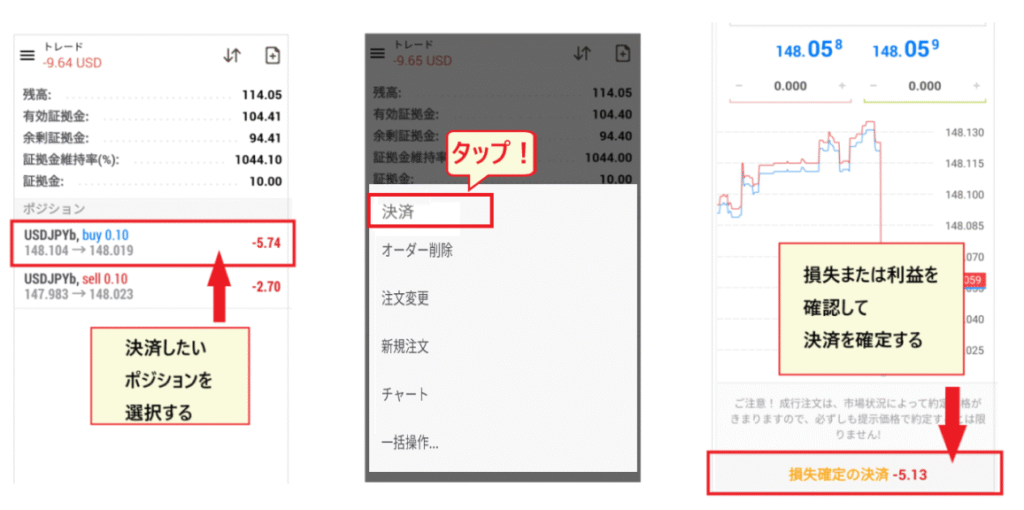 「決済」をタップすると、リアルタイムのレートと損益額が表示されますので、問題がなければ「確定」ボタンを押して損失または利益の確定です。