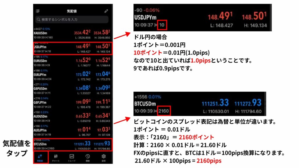 スプレッドは、ポイントで表示されています。1ポイント=0.1pipsです。