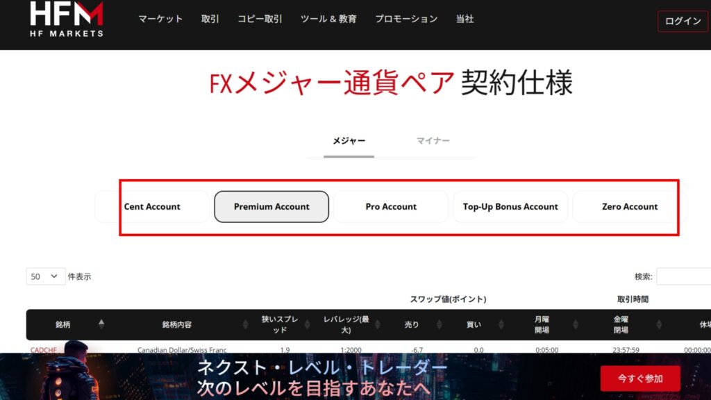 銘柄プレミアム口座ボーナス口座プロ口座ゼロ口座セント口座HFコピー口座