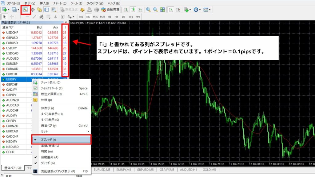 この状態で調べたい通貨ペアの所で右クリックをして、スプレッドを押します。
