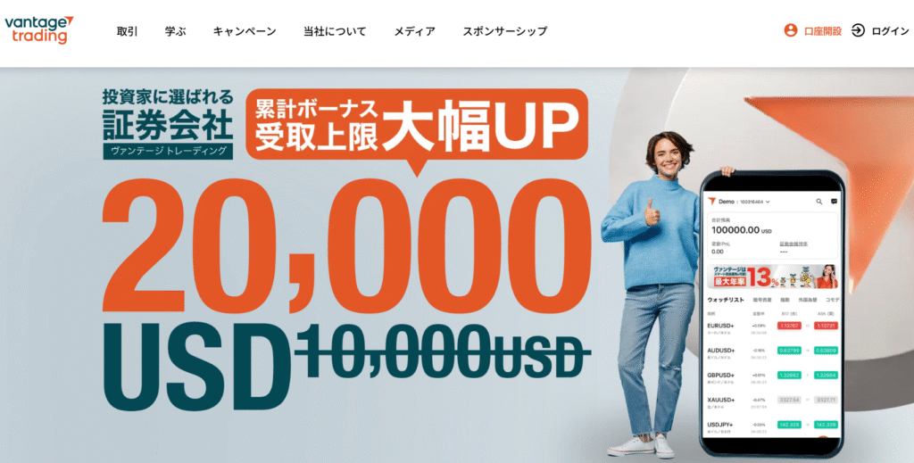 Vantage![]() | 40種類以上(“Over 40”と公式明記) | 最大200倍(仮想通貨CFD) | 24/7取引OK。低レバ設定で初心者向け。 |