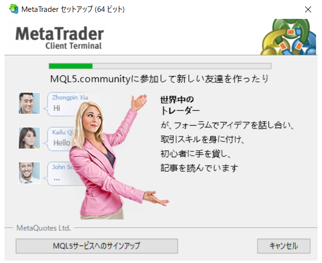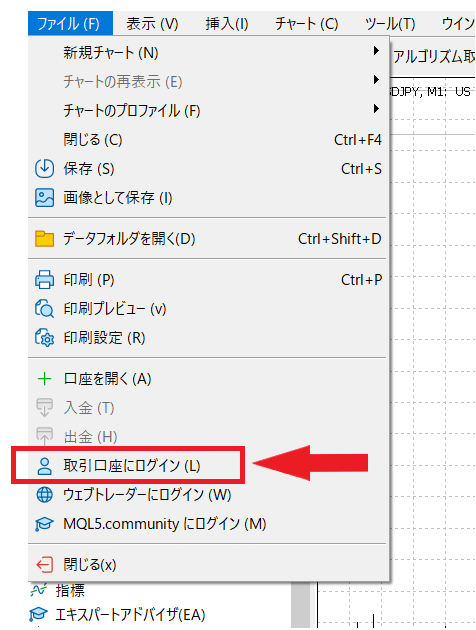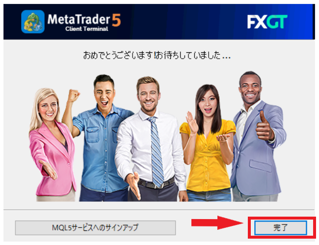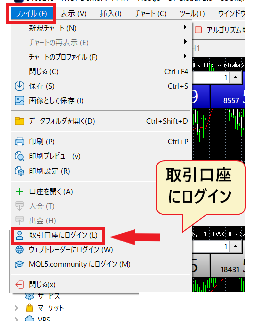 次のステップは、「取引口座にログイン」をクリックして、IDとパスワードでMT5にログインです。