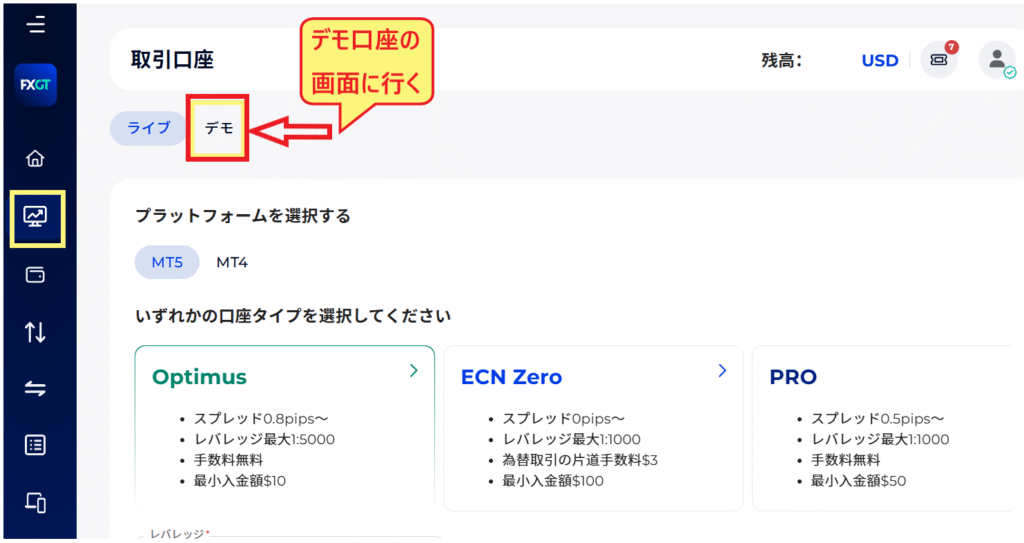 FXGTのデモ口座は、6つの口座タイプから選択可能。ハイレバレッジ5000倍のOptimus口座にもデモでチャレンジできます。