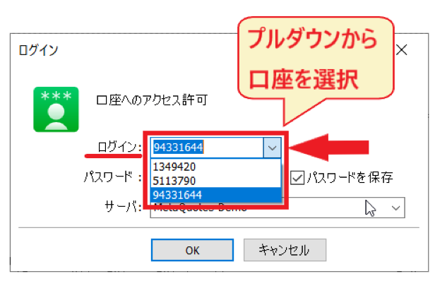 ログイン情報を保存をしておけば、アカウントの切り替えも簡単です。MetaTraderのデモ口座を複数作成したり、異なる業者のアカウント登録にも便利な方法です。