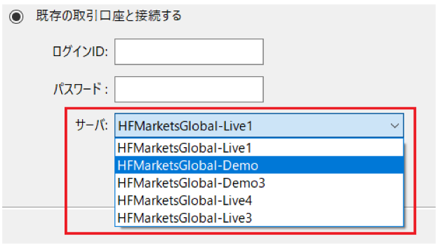 会社名を検索することで、海外FX業者のサーバー名がプルダウンから選べるようになります。