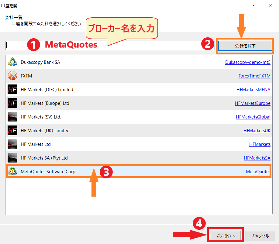 例えば、HFMarketのデモ口座を登録するとすれば、サーバー名「HF Market」を入力して、会社名「HF Market (SV) Ltd」を選択する流れです。