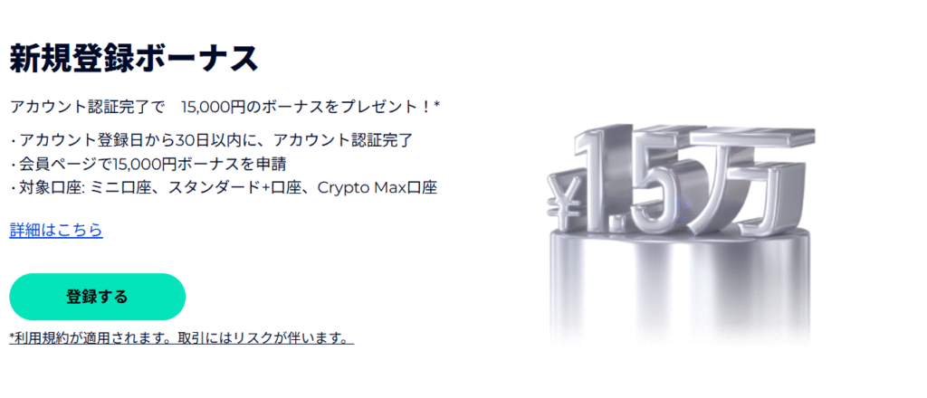 リアル口座の開設を前提とした場合、FXGTは最高の条件の備えた海外FX業者です。新規口座開設をすると、トレードで使える証拠金が15,000円分もらえます。