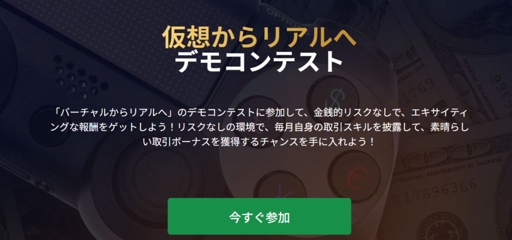 デモトレードコンテストで入賞すると、「1位:取引ボーナス2,000ドル」「2位:取引ボーナス1,000ドル」が付与されます。もらったボーナスはリアル口座のトレードに使えます。入金不要の参加ですので、ぜひ試してみてください。