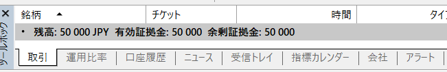 ログインすると、設定した入金額が取引が取引メニューに表示されます。MT5の一番下にあるツールボックスのタグメニュー「取引」から確認できます。